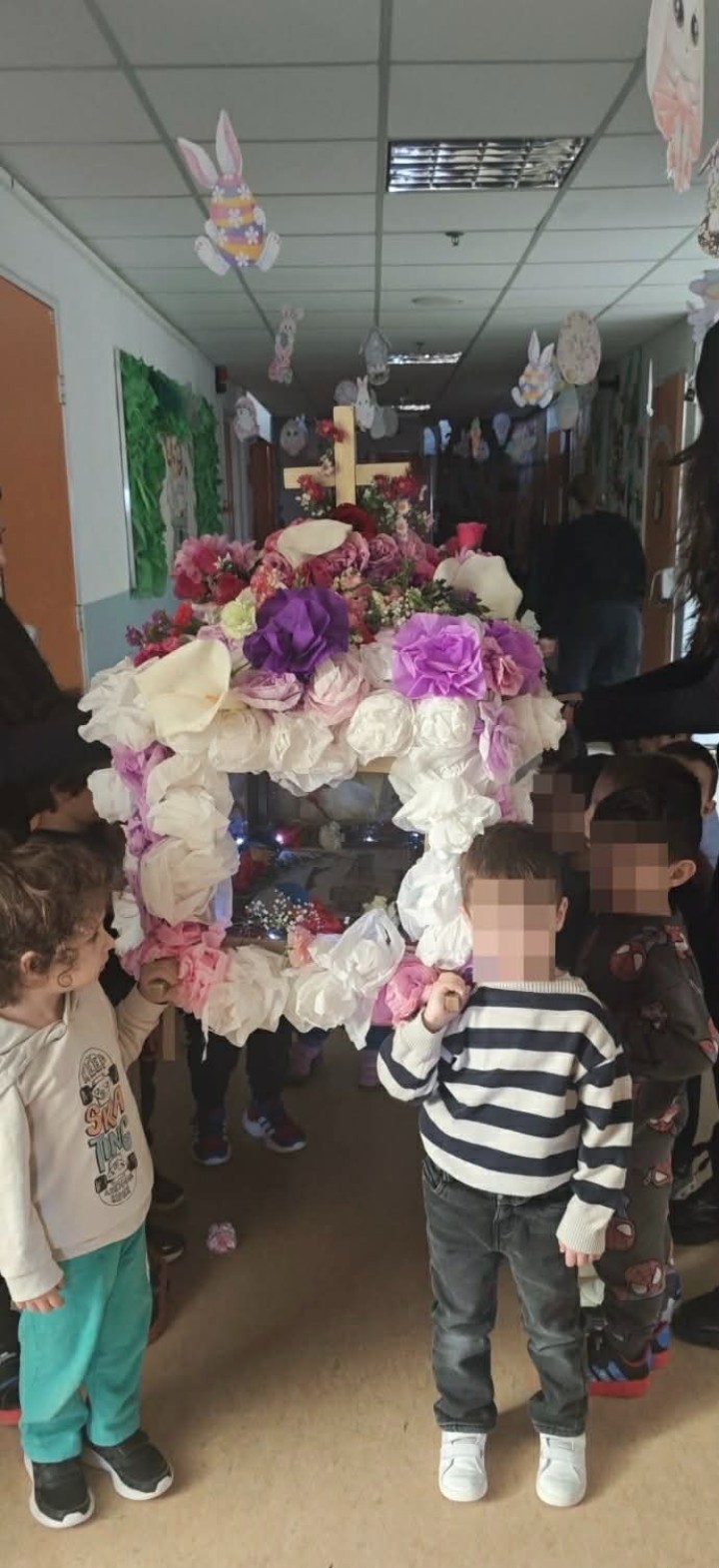 Τα κορίτσια στόλισαν με λουλούδια τον Επιτάφιο, τα αγόρια τον σήκωσαν με προσοχή και στη συνέχεια όλα τα παιδιά πέρασαν από κάτω του με ευλάβεια, βιώνοντας με τον δικό τους τρυφερό τρόπο τη σημασία των Άγιων αυτών ημερών.