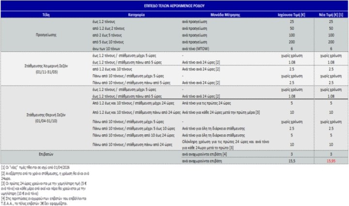 Κατόπιν της διαβούλευσης, η από 30.01.2026 Απόφαση της Fraport Περιφερειακά Αεροδρόμια της Ελλάδας Β Α.Ε. σχετικά με το επίπεδο των αερολιμενικών τελών του αερολιμένα Ρόδου «Διαγόρας» για το έτος 2026, προέβλεπε ότι, από την 01.04.2026, το επίπεδο τελών Αερολιμένα Ρόδου διαμορφώνεται ως ακολούθως: