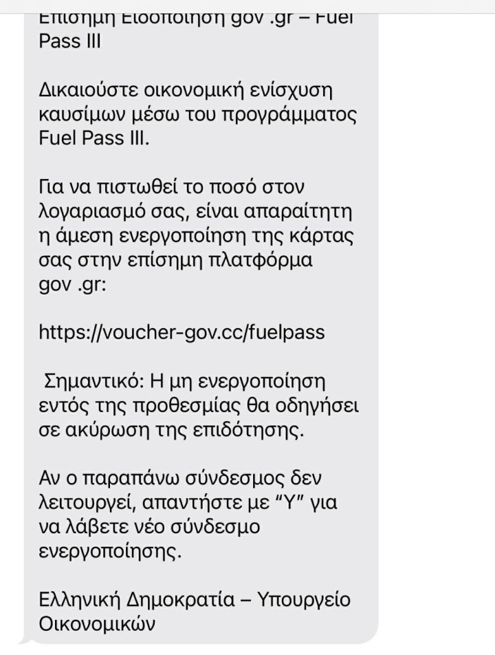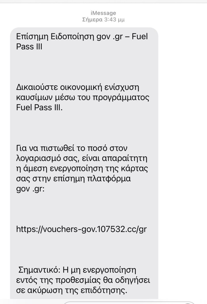 Έστειλαν δήθεν μηνύματα από το υπουργείο Οικονομικών που ενημερώνουν τους πολίτες ότι δικαιούνται επίδομα καυσίμων και τους προτρέπουν να πατήσουν σε σχετικό σύνδεσμο για να το λάβουν (φωτογραφία Α). Φυσικά, πρόκειται για άλλη μία παγίδα με στόχο την υποκλοπή στοιχείων.