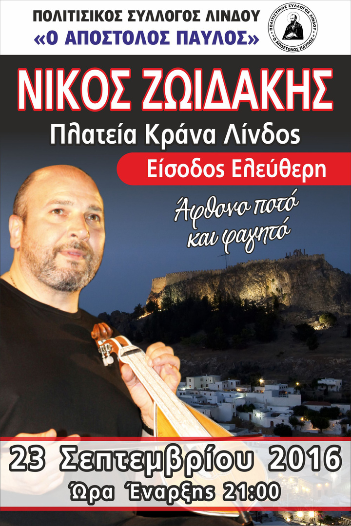Εκδήλωση με τον Νίκο Ζωιδάκη διοργανώνει την Παρασκευή 23 Σεπτεμβρίου ο Πολιτιστικός Σύλλογος Λίνδου «Απόστολος Παύλος», στην πλατεία της Κράνας, στο πλαίσιο της ψυχαγωγίας των κατοίκων και των επισκεπτών του οικισμού.