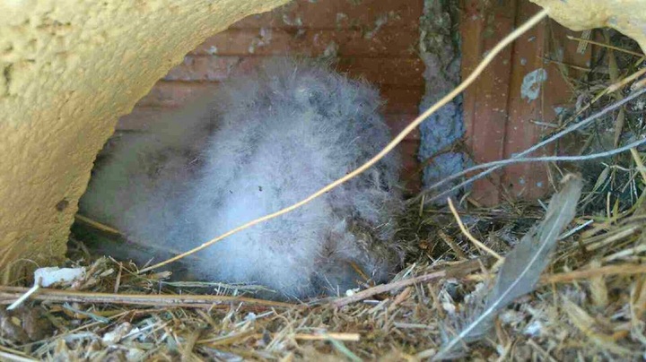 Αναγνωρίσαμε αμέσως ένα μωρό γκιώνη και, μιας και η αυλή είναι εσωτερική και δεν έχει δέντρα, συμπεράναμε ότι η φωλιά πρέπει να είναι στο κτήριο.