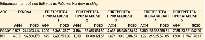 Όπως προκύπτει από τα στοιχεία, στο Ηράκλειο μέσα από τους 5 κύκλους της Επιστρεπτέας Προκαταβολής, ωφελήθηκαν 19.611 ΑΦΜ και μοιράστηκαν 300,4 εκατ. ευρώ και στη Ρόδο 241,4 εκατ. ευρώ καταβλήθηκαν σε 9.973 ΑΦΜ. Όσον αφορά την ΦΑΕΕ Αθηνών, δόθηκαν 578,3 εκατ. ευρώ σε 4.598 ΑΦΜ.