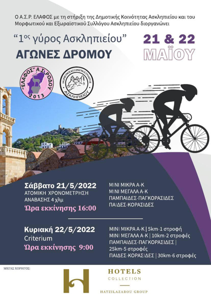 Ο «1ος Γύρος Ασκληπειού» περιλαμβάνει τον σημερινό αγώνα ατομικής χρονομέτρησης 4χλμ. από το Κιοτάρι ως το Ασκληπειό μ’ εκκίνηση στις 16.00, ενώ το αυριανό criterium 5χλμ. θα ξεκινήσει στις 9.00 και οι ποδηλάτες θα κινούνται στον περιφερειακό δρόμο του χωριού.
