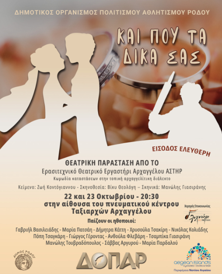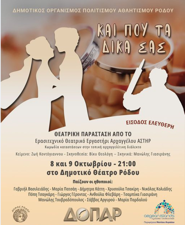 Το Ερασιτεχνικό Θεατρικό Εργαστήρι Αρχαγγέλου «ΑΣΤΗΡ» παρουσίαζει την κωμική θεατρική παράσταση «Και που τα δικά σας» στην τοπική αρχαγγελίτικη διάλεκτο. Σήμερα Σάββατο και αύριο Κυριακή, 9 Οκτωβρίου, στο Δημοτικό Θέατρο Ρόδου, στις 21:00. Είσοδος Ελεύθερη.
