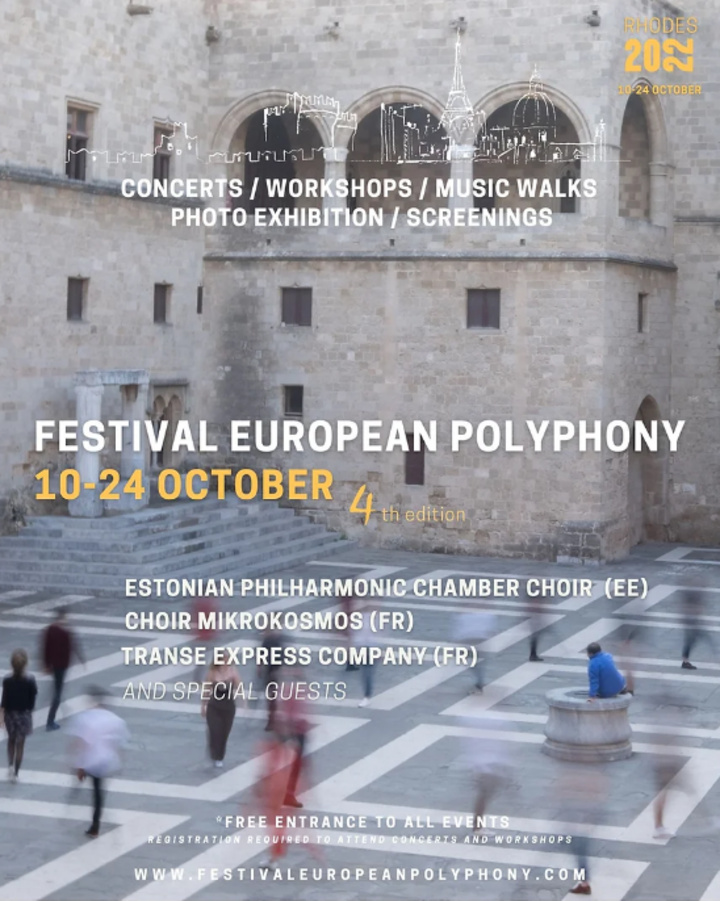 Το 4ο Φεστιβάλ Ευρωπαϊκης Πολυφωνίας έρχεται στη Ρόδο από την Δευτέρα 10 έως την Δευτέρα 24 Οκτωβρίου και μεταμορφώνει την Μεσαιωνική Πόλη σε ένα εργαστήρι μουσικής και τέχνης.