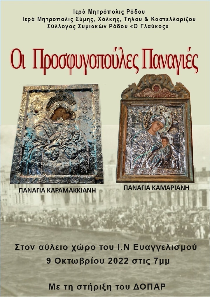 Αύριο, Κυριακή 9 Οκτωβρίου, στις 19:00 στον αύλειο χώρο του Ευαγγελισμού θα πραγματοποιηθεί εκδήλωση με τίτλο «Οι προσφυγοπούλες Παναγιές» από τον Σύλλογο των Συμιακών με αφηγηματικά κείμενα, παραδοσιακή και λαϊκή ορχήστρα καθώς και χορούς της Μικράς Ασίας με φορεσιές από τα Φάρασα της Καππαδοκίας.