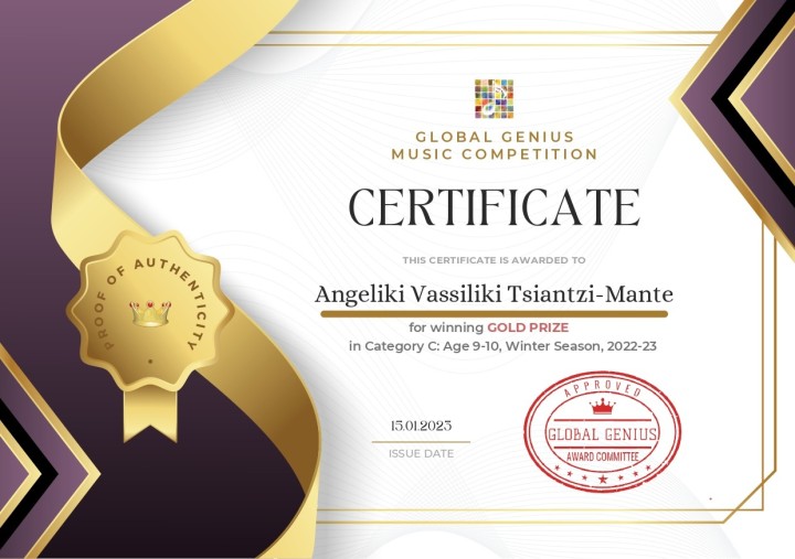 Ο διαγωνισμός Global Genius βραβεύει τα παιδιά με ιδιαίτερο ταλέντο και μεγάλες δυνατότητες για μελλοντική εξέλιξη. Η 10χρονη Αγγελίνα Τσιαντζή-Μαντέ, έλαβε το Χρυσό βραβείο στο πιάνο στην ηλικιακή κατηγορία της, καθώς και το Ειδικό Βραβείο της κριτικής επιτροπής για την εξαιρετική τεχνική της "Excellent Technique Special Prize”.