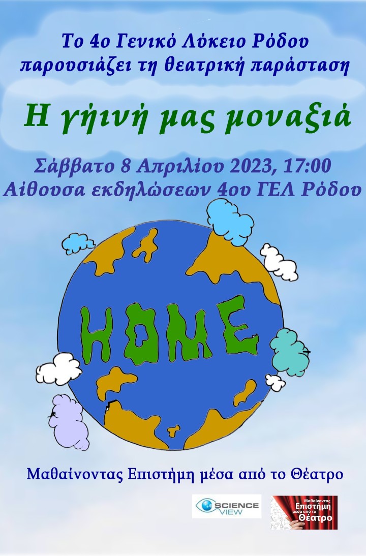 Η Ομάδα Θεάτρου Επιστήμης του 4ου Γενικού Λυκείου Ρόδου σας προσκαλεί το Σάββατο 8 Απριλίου 2023 και ώρα 5:00 μ.μ. στην παράσταση «Η γήινή μας μοναξιά» στην αίθουσα εκδηλώσεων του σχολείου.