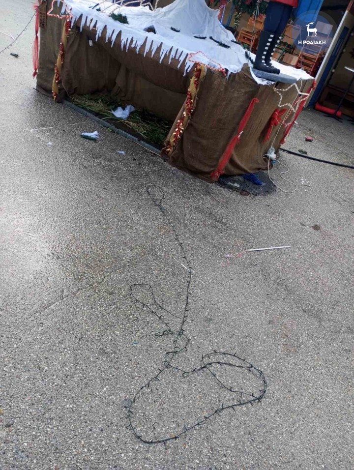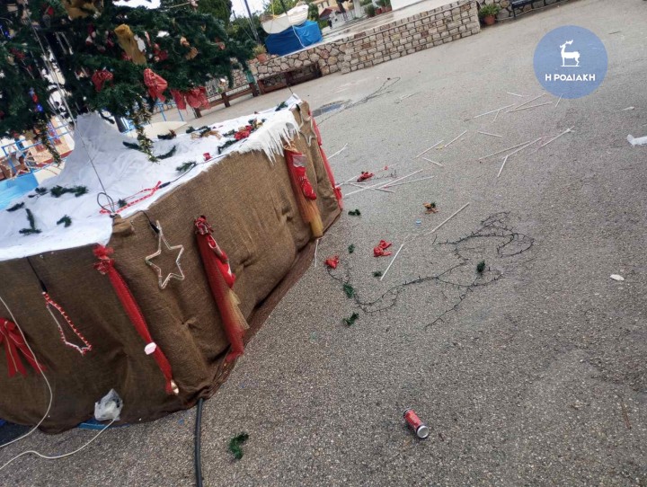 Όπως φαίνεται από τις φωτογραφίες που απέστειλαν στη ΡΟΔΙΑΚΗ μέλη του Συλλόγου, οι άγνωστοι δράστες προκάλεσαν εκτεταμμένες φθορές στον στολισμό του δέντρου, καταστρέφοντας, μεγάλο μέρος του! Έσπασαν τα λαμπιόνια, τον διάκοσμο και κατέστρεψαν τον στολισμό που με τόση αγάπη και φροντίδα είχαν επιμεληθεί τα μέλη του συλλόγου με τα παιδιά τους τις προηγούμενες μέρες.