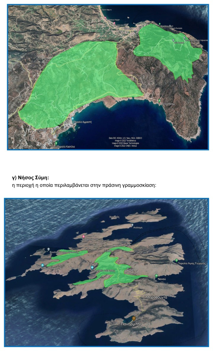 Για το νησί της Ρόδου, οι περιοχές που θα ισχύσει η απαγόρευση φαίνονται στους εξής τρεις χάρτες.