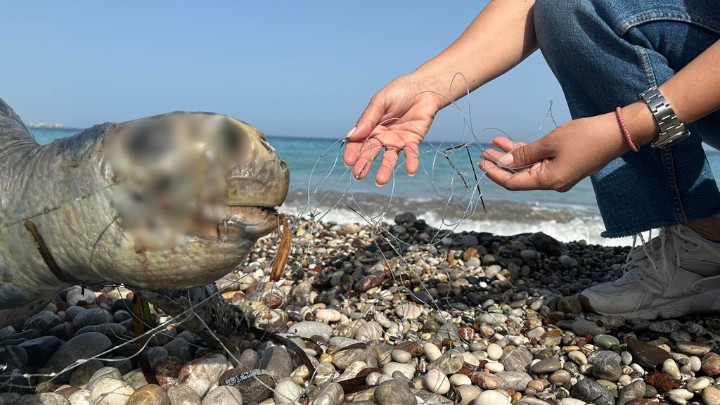 Μπλεγμένη σε αγκίστρια και πετονιές ξεβράστηκε θαλάσσια χελώνα στα Κρητικά
