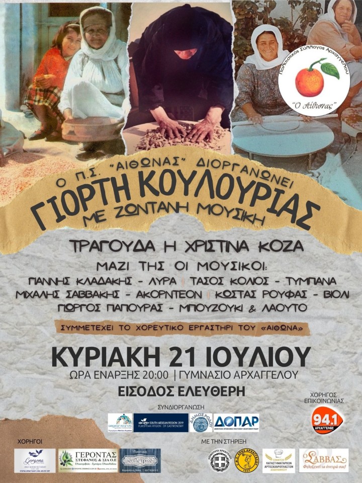 Ο Πολιτιστικός Σύλλογος Αρχαγγέλου «Αίθωνας» προσκαλεί το κοινό της Ρόδου στη Γιορτή Κουλουρίας την Κυριακή 21 Ιουλίου στις 20.00 στον αύλειο χώρο του Γυμνασίου Αρχαγγέλου.