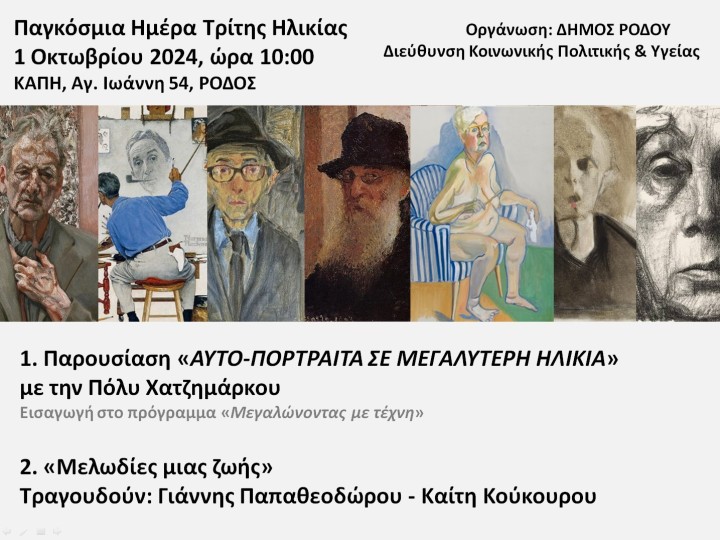 Την Τρίτη 1η Οκτωβρίου στο ΚΑΠΗ (Αγίου Ιωάννη 54) και ώρα 10:00πμ καλούμε όσους και όσες επιθυμούν στην παρουσίαση «Αυτο-πορτραίτα σε μεγαλύτερη ηλικία» από την Πόλυ Χατζημάρκου ιστορικό Τέχνης, MSc Διοίκηση Πολιτισμικών Μονάδων, Ειδική Σύμβουλο Δημάρχου Ρόδου. Πρόκειται για την προβολή καλλιτεχνών σε μεγαλύτερη ηλικία, παρουσιάζοντας παράλληλα το πρόγραμμα τέχνης και δημιουργικής γήρανσης "Μεγαλώνοντας με τέχνη" που θα ξεκινήσει στο ΚΑΠΗ μέσα στον Οκτώβριο (περισσότερες πληροφορίες σε λίγες μέρες).