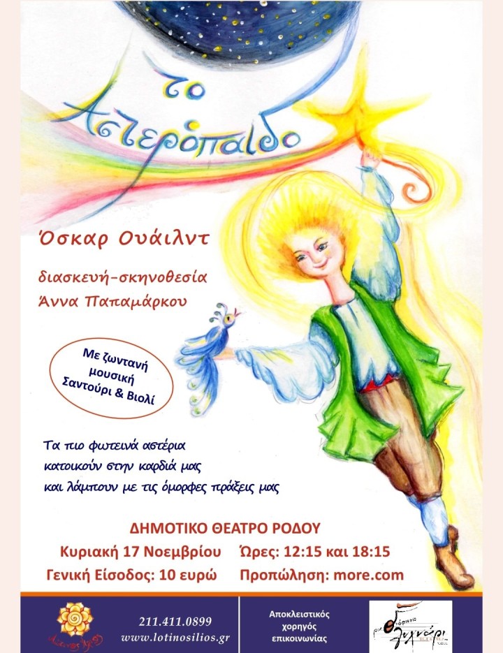 Το τρυφερό παραμύθι του Όσκαρ Ουάιλντ, που έχει διαβαστεί από εκατομμύρια αναγνώστες, κάθε ηλικίας, σε όλο τον κόσμο, δραματοποιείται επί σκηνής, συνδέοντας την τέχνη της αφήγησης με την τέχνη του θεάτρου. Ο θίασος «Λώτινος Ήλιος» παρουσιάζει στο Δημοτικό Θέατρο Ρόδου, την παιδική παράσταση «Το Αστερόπαιδο» του Όσκαρ Ουάιλντ, σε σκηνοθεσία Άννας Παπαμάρκου.