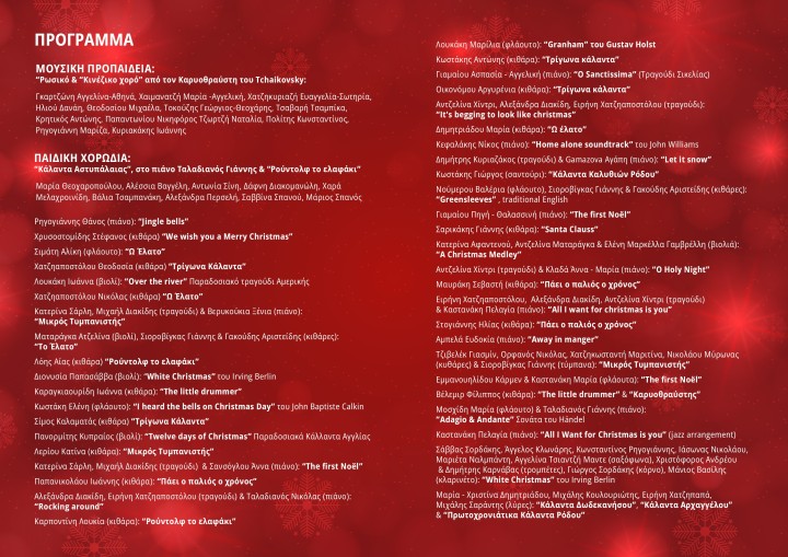 Την Πέμπτη 19 Δεκεμβρίου 2024 και ώρα 19:00 στο Δημοτικό Θέατρο Ρόδου θα μας ταξιδέψουν με Χριστουγεννιάτικες Μελωδίες οι σπουδαστές των τμημάτων Πιάνου, Κιθάρας, Φλάουτου, Βιολιού, Κλαρινέτου, Κόρνου, Σαξοφώνου, Τρομπέτας, Μονωδίας, Λύρας, Σαντουριού, το Εργαστήρι Παιδικής Χορωδίας και το τμήμα της Μουσικής Προπαιδείας, μαζί με τους καθηγητές τους: