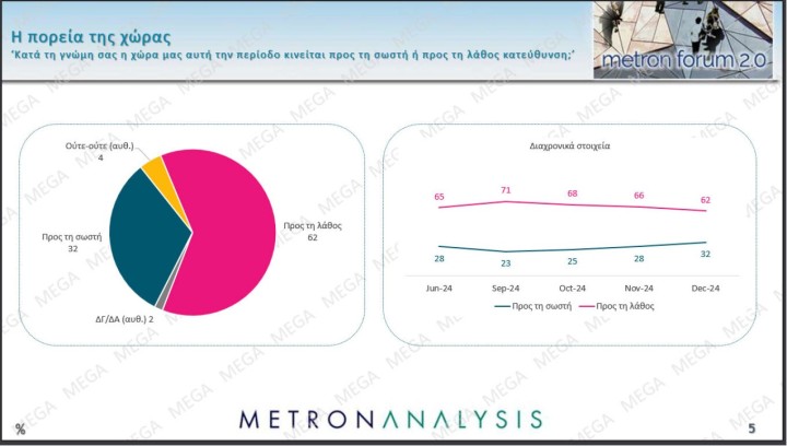 Κερδισμένη βγαίνει η κυβέρνηση από την διαδικασία της ψήφισης του προϋπολογισμού του 2025, σύμφωνα με τα αποτελέσματα της δημοσκόπησης της Metron Analysis που παρουσιάστηκε στο κεντρικό δελτίο του Mega. Η ΝΔ κερδίζει μία μονάδα και ανεβαίνει στο 29,2% στην εκτίμηση ψήφου, ενώ παράλληλα βελτιώνονται όλοι οι ποιοτικοί δείκτες της διακυβέρνησης - μειώνεται σημαντικά η απαισιοδοξία των πολιτών τόσο για την προσωπική τους κατάσταση, όσο και για την πορεία της χώρας.