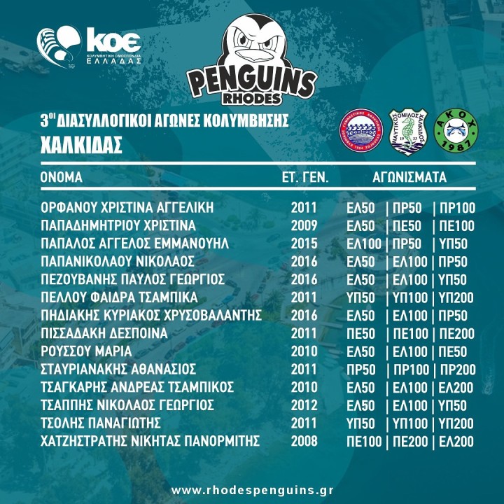 «Με 29 αθλητές και αθλήτριες, η ομάδα των Πιγκουίνων Ρόδου αναχωρεί για άλλη μια χρονιά για τους διασυλλογικούς αγώνες κολύμβησης που θα διεξαχθούν στην Χαλκίδα από 11 έως 13 Απριλίου.