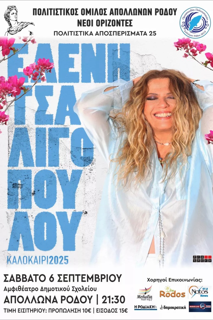 Ένα φθινοπωρινό βράδυ στη Ρόδο, το Σάββατο 6 Σεπτεμβρίου, η φωνή της Ελένης Τσαλιγοπούλου θα γεμίσει τον ουρανό στ’ Απόλλωνα με νότες, συναισθήματα και μνήμες.