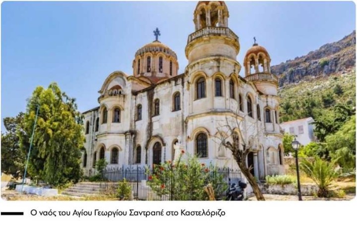 Πρόκειται για τον ιερό ναό του Αγίου Γεωργίου Σαντραπέ, από το όνομα του Καστελοριζιού Λουκά Σαντραπέ που ξεκίνησε την ανέγερσή του ή Αγίου Γεωργίου του χωραφιού, όπως τον αποκαλούν οι ντόπιοι.