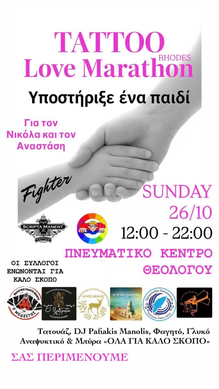 Η Ομοσπονδία Πολιτιστικών Συλλόγων Ρόδου συμμετέχει στην εκδήλωση "TATTOO Love Marathon Rhodes", που θα πραγματοποιηθεί την Κυριακή 26 Οκτωβρίου 2025, από τις 12:00 έως τις 22:00, στο Πνευματικό Κέντρο Θεολόγου.