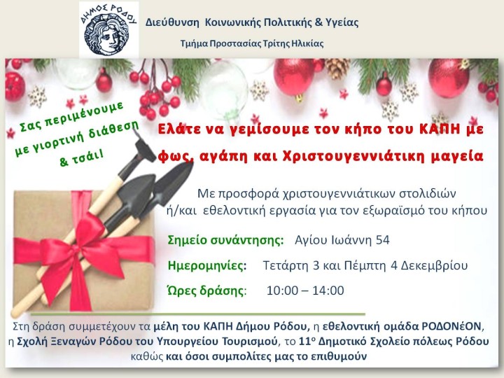 Οι γιορτές πλησιάζουν και θέλουμε ο κήπος του ΚΑΠΗ δήμου Ρόδου να γίνει ένας χώρος χαράς και συνάντησης για όλους. Γι’ αυτό, την Τετάρτη 3 Δεκεμβρίου και Πέμπτη 4 Δεκεμβρίου, τα μέλη του ΚΑΠΗ δήμου Ρόδου, η εθελοντική ομάδα ΡΟΔΟΝέΟΝ, η Σχολή Ξεναγών Ρόδου του υπουργείου Τουρισμού, το 11ο Δημοτικό Σχολείο πόλεως Ρόδου καθώς και όσοι συμπολίτες μας το επιθυμούν, ενώνουμε τις δυνάμεις μας σε μια όμορφη, συμμετοχική και γιορτινή πρωτοβουλία.