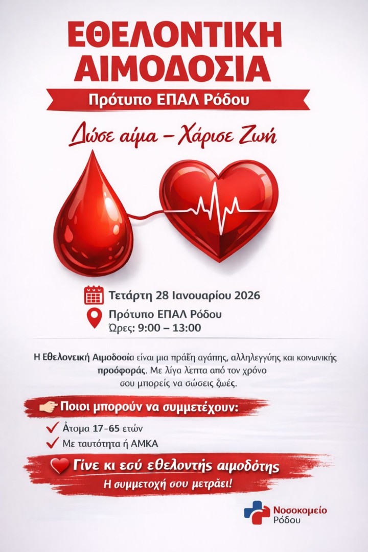 Στην «καρδιά» του Πρότυπου ΕΠΑ.Λ. Ρόδου, μια πρωτοβουλία με βαθύ ανθρωπιστικό νόημα φέρνει την αλληλεγγύη στο προσκήνιο. Την Τετάρτη 28 Ιανουαρίου 2026, από τις 9:00 το πρωί έως τις 13:00 το μεσημέρι, η σχολική κοινότητα ενώνεται για έναν σκοπό που ξεπερνά κάθε όριο: την εθελοντική αιμοδοσία. Σε συνεργασία με το Γενικό Νοσοκομείο Ρόδου, μαθητές άνω των 17 ετών, εκπαιδευτικοί και ενήλικοι πολίτες καλούνται να προσφέρουν μια σταγόνα ζωής, αναδεικνύοντας τη σημασία του εθελοντισμού και της συλλογικής ευθύνης.