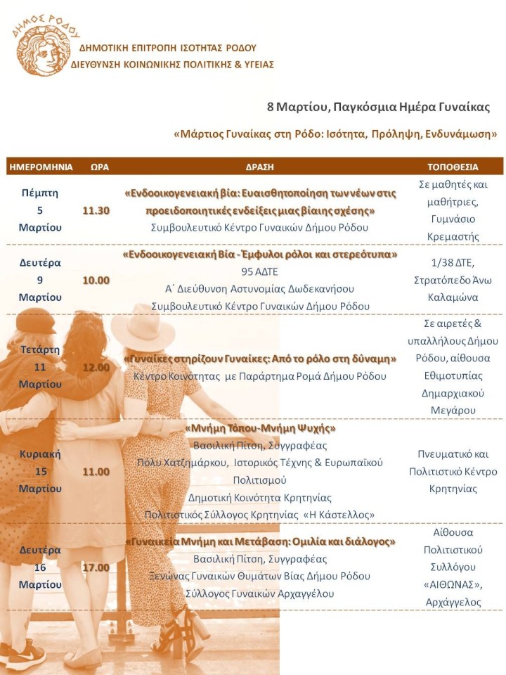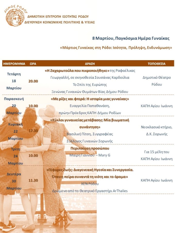 Με αφορμή την Παγκόσμια Ημέρα της Γυναίκας, η Δημοτική Επιτροπή Ισότητας Ρόδου και η Διεύθυνση Κοινωνικής Πολιτικής & Υγείας του Δήμου Ρόδου διοργανώνουν ένα ευρύ πλαίσιο δράσεων με τίτλο: «Μάρτιος Γυναίκας στη Ρόδο: Ισότητα, Πρόληψη, Ενδυνάμωση», καθ’ όλη τη διάρκεια του Μαρτίου 2026, με στόχο την ευαισθητοποίηση, την ενδυνάμωση και την ανάδειξη του ρόλου της γυναίκας στη σύγχρονη κοινωνία.