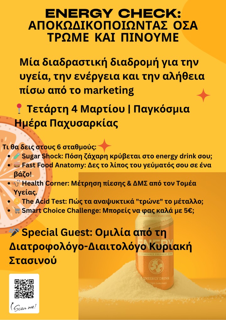 «Με μια πρωτοποριακή βιωματική δράση υπό τον τίτλο “Hacking Your Body: Το Update που χρειάζεται η διατροφή σου”, το Πρότυπο ΕΠΑ.Λ. Ρόδου τίμησε σήμερα την Παγκόσμια Ημέρα Παχυσαρκίας. Η εκδήλωση, που συνδύασε την επιστημονική γνώση με την πρακτική εφαρμογή, έδωσε την ευκαιρία στους μαθητές να δουν “πίσω από τις ετικέτες” των προϊόντων που καταναλώνουν καθημερινά.