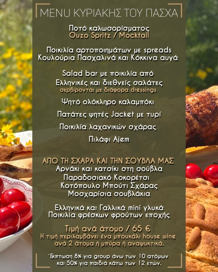 Οι παραπάνω τιμές περιλαμβάνουν 1 μπουκάλι house wine ανά 2 άτομα, ενώ παρέχεται έκπτωση 8% για groups 10 ατόμων και άνω και 50% για παιδιά κάτω των 12 ετών.