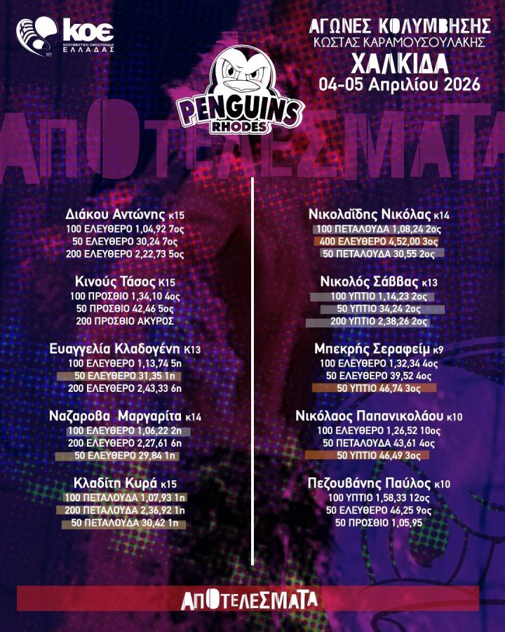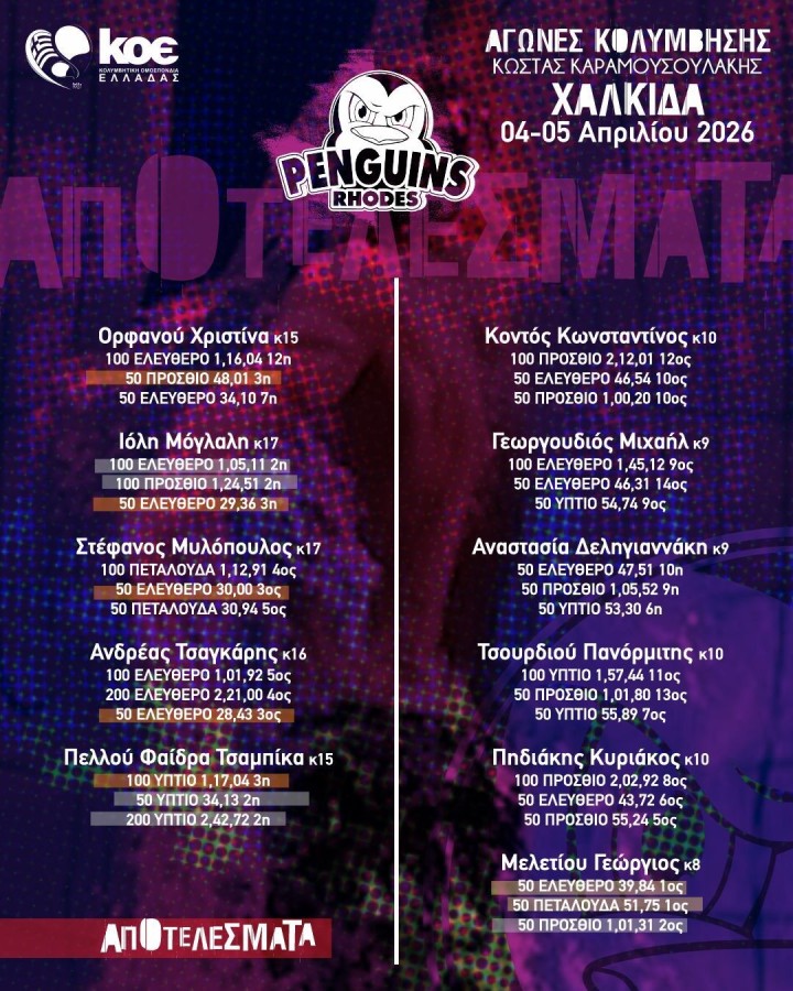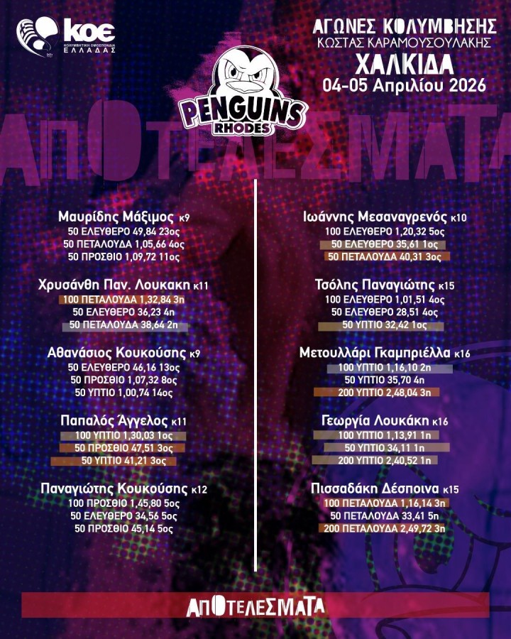Με σημαντικές διακρίσεις, πολύτιμες εμπειρίες και έντονο αγωνιστικό παλμό επέστρεψε στη Ρόδο η αποστολή των Πιγκουίνων από τους διασυλλογικούς αγώνες κολύμβησης που φιλοξενήθηκαν στη Χαλκίδα. Οι αθλητές και οι αθλήτριες του συλλόγου πραγματοποίησαν εξαιρετικές εμφανίσεις, κατακτώντας συνολικά 51 μετάλλια και αποδεικνύοντας ότι η συστηματική δουλειά και η αγωνιστική συνέπεια αποδίδουν καρπούς.