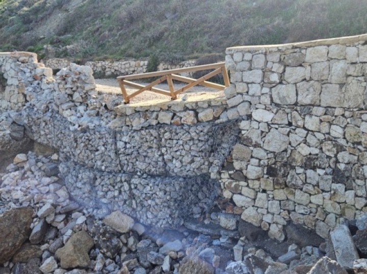 Στον παραλιακό πεζόδρομο, οι τεχνικές υπηρεσίες διέγνωσαν ανεπανόρθωτη βλάβη στα υφιστάμενα συρματοκιβώτια (σ.σ. ζαρζανέτια) λόγω υποσκαφής.