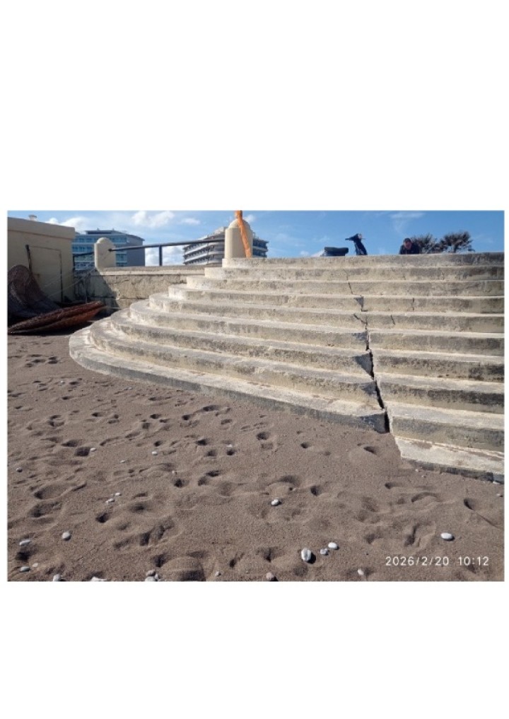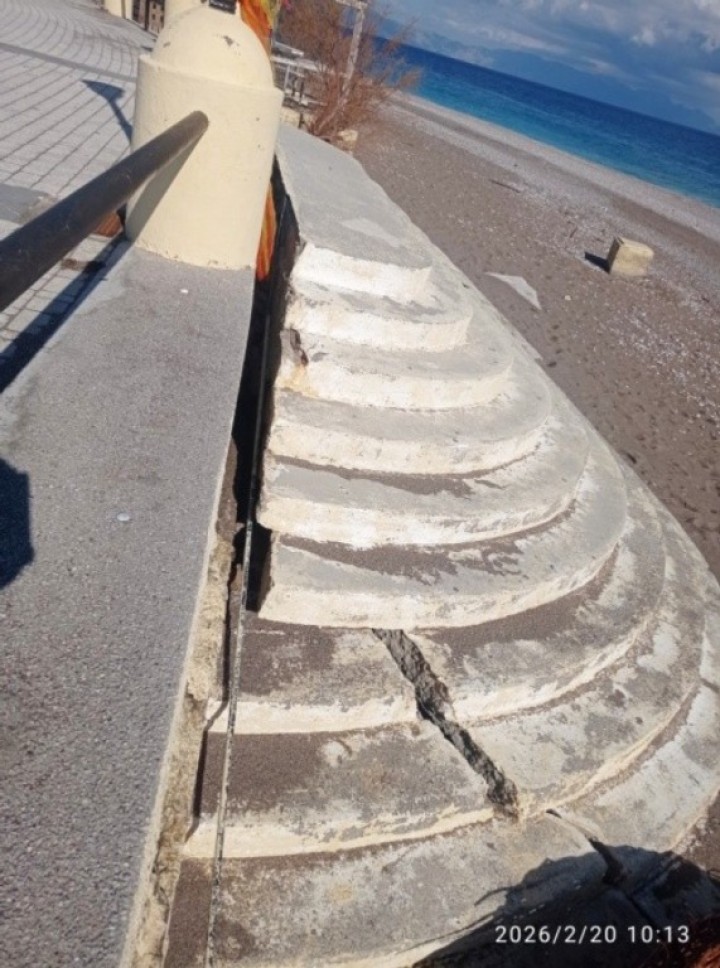 - Καθίζηση κλίμακας: Η μεγάλη σκάλα που οδηγεί από το Ενυδρείο στην παραλία αποκολλήθηκε από τον τοίχο, παρουσιάζοντας ρωγμές εύρους άνω των 15εκ..