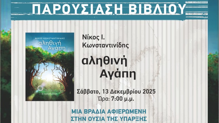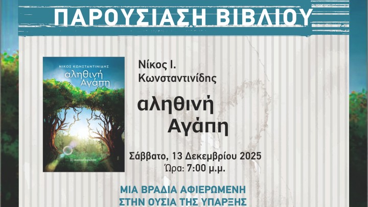 Πολιτισμός - Εκδηλώσεις 13.12.2025 11:30 Σήμερα η παρουσίαση του νέου μυθιστορήματος «αληθινή Αγάπη» του Νίκου Ι. Κωνσταντινίδη στη Ρόδο
