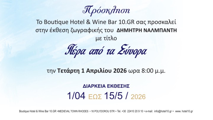 Πολιτισμός - Εκδηλώσεις 01.04.2026 16:15 Ρόδος: Σήμερα τα εγκαίνια της έκθεσης του Δημήτρη Ναλμπάντη στο 10GR