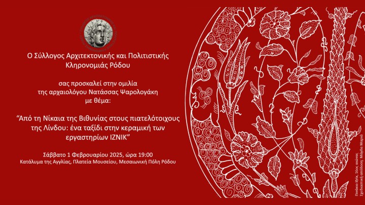 Πολιτισμός - Εκδηλώσεις 28.01.2025 19:30 Ομιλία: «Από τη Νίκαια της Βιθυνίας στους πιατελότοιχους της Λίνδου – ένα ταξίδι στην κεραμική των εργαστηρίων ΙΖΝΙΚ»