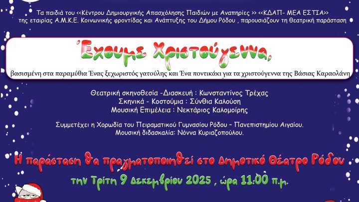 Πολιτισμός - Εκδηλώσεις 03.12.2025 13:30 «Έχουμε Χριστούγεννα»: Μια… γιορτή Αποδοχής και Αγάπης στη σκηνή του Δημοτικού Θεάτρου Ρόδου