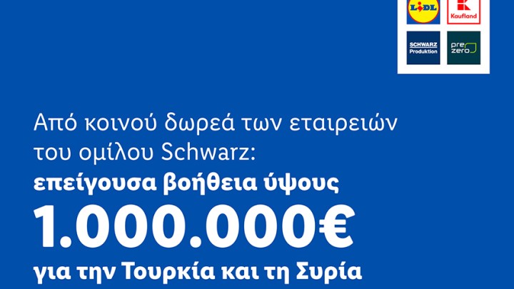 Επιχειρείν 13.02.2023 14:55 Από κοινού δωρεά των εταιρειών του ομίλου Schwarz: επείγουσα βοήθεια ύψους 1 εκατ. ευρώ για την Τουρκία και τη Συρία
