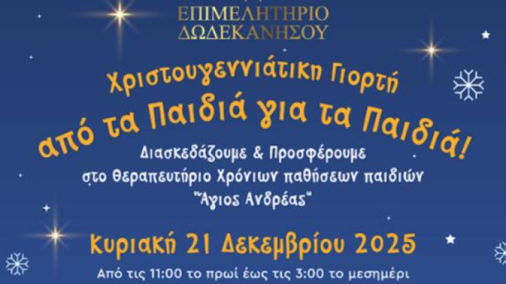 Επικαιρότητα 18.12.2025 18:00 Χριστουγεννιάτικη Γιορτή «από τα Παιδιά για τα Παιδιά» στο Επιμελητήριο Δωδεκανήσου!